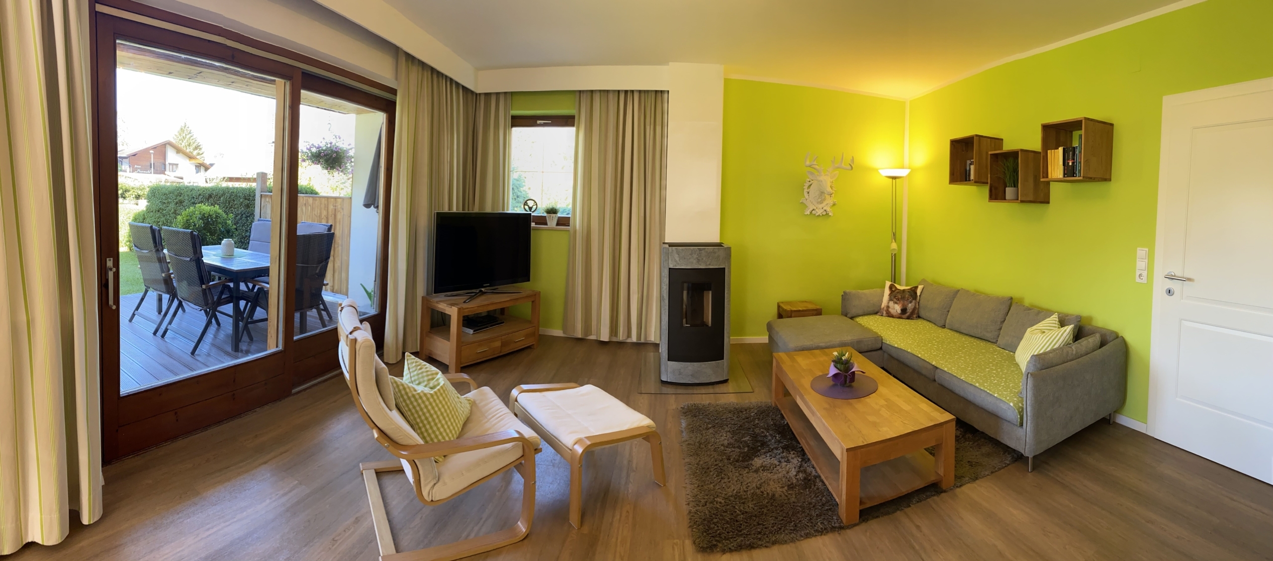 - Wohnzimmer mit gemütlicher Eckcouch und Kuscheldecke, zwei Relaxsessel, 46 Zoll LCD-TV mit HD Sat-Receiver und DVD Player, digital gesteuerter Pelletofen